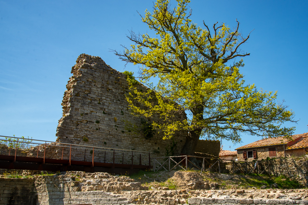 Varie campagne di scavo archeologico hanno portato alla luce gli ambienti del cassero e le strutture preromane sulle quali il castello fu edificato. Vuole la leggenda che sarebbe questo il castello nel quale visse e morì tragicamente Pia de’ Tolomei, le cui vicende sono narrate da Dante Alighieri nella Divina Commedia. Un boschetto dominato da ornielli e bagolari circonda l’area archeologica. Nei pressi è stato rinvenuto anche un riparo abitato dall’uomo di Neanderthal, detto “riparo Cavanna” dal nome dello scopritore.
